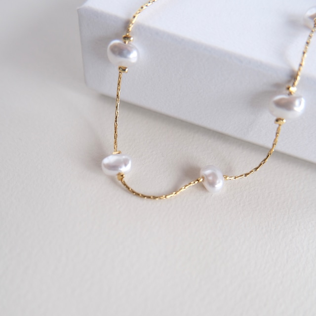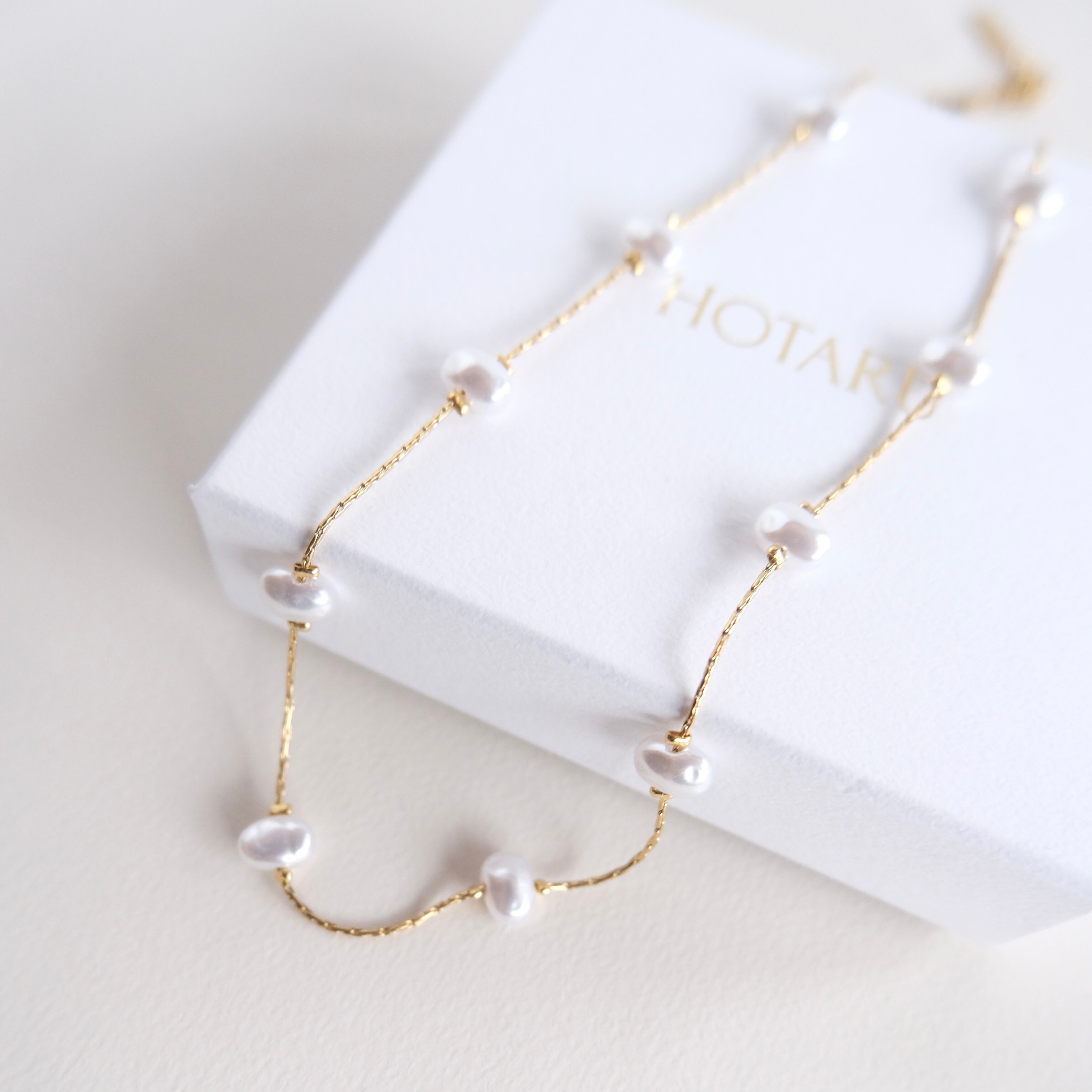 エレガントな輝きを放つバロックパールを、繊細なゴールドチェーンにランダムに配置しております。