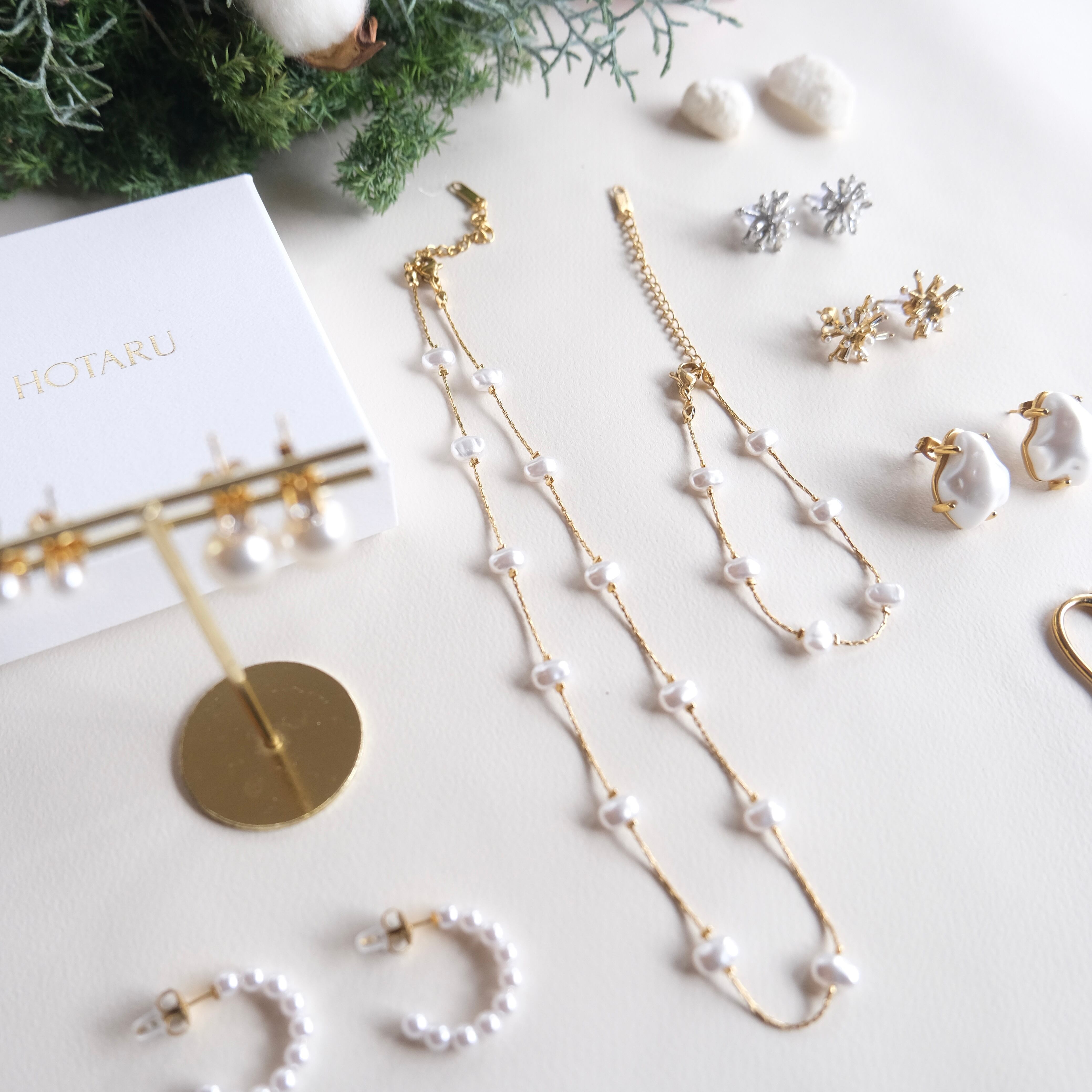 HOTARUのアクセサリーは、すべて「付けっぱなし」を前提に考えています。アイテムには、丈夫で錆びにくい素材を使用しているため、着脱の手間を気にせず、いつでもお洒落を楽しめます。