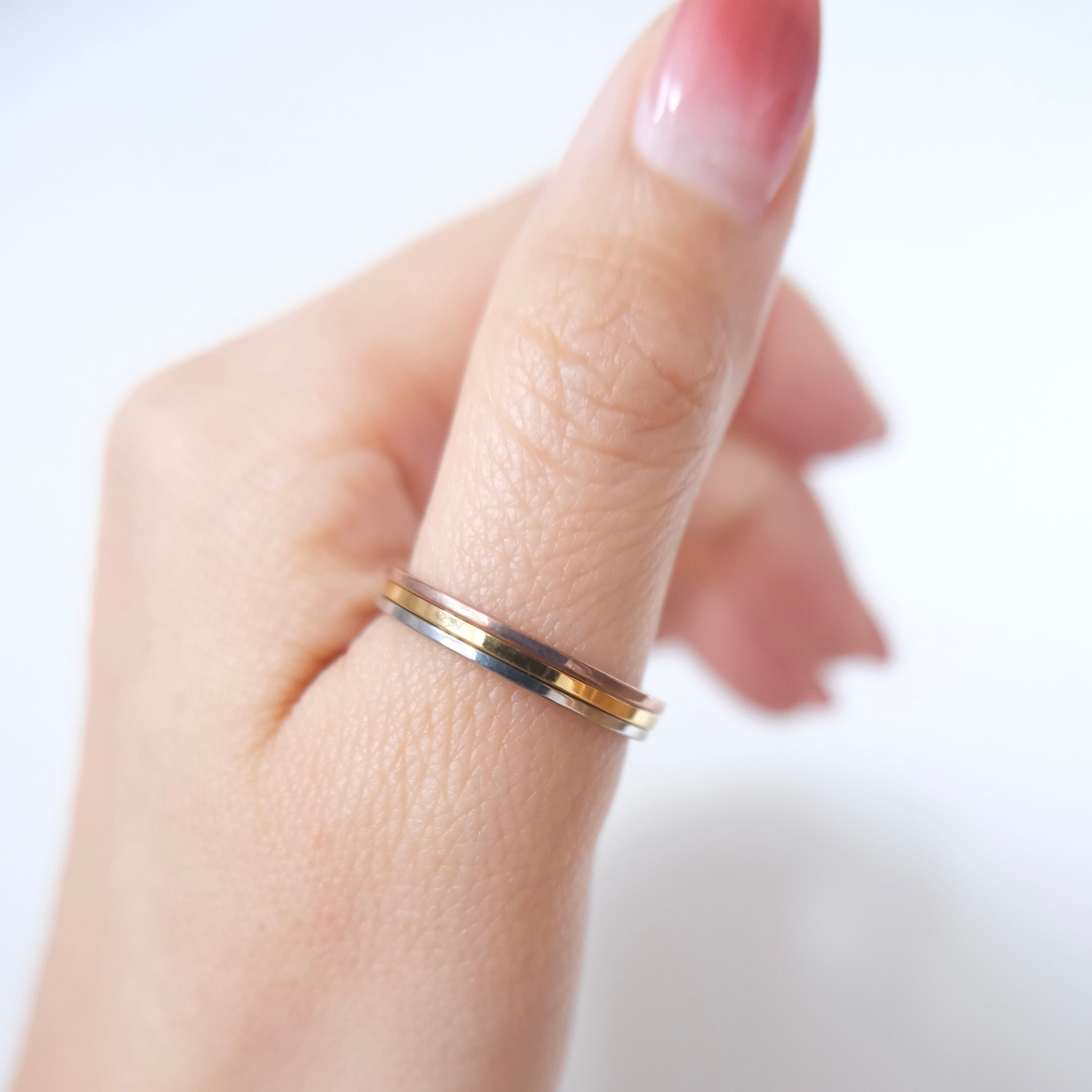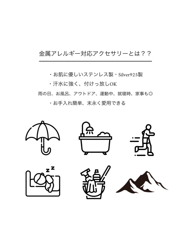 金属アレルギーでお悩みの方にも楽しんでいただけるよう、**ステンレス(SUS316L)**等を採用しています。肌に優しく、傷つきにくい素材なので、毎日着用しても美しさが長持ちします。